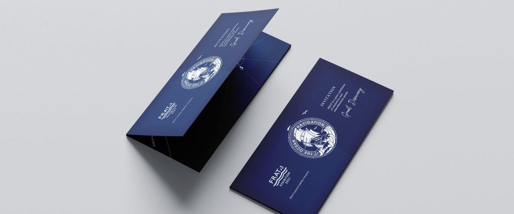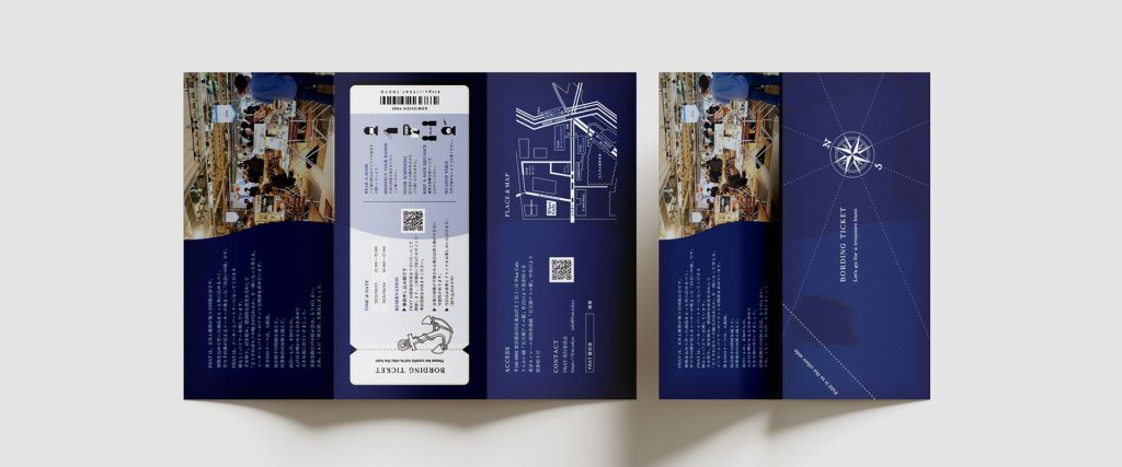 三つ折りのフライヤーを開くとFRATの乗船チケットが挟んであるように見えるイメージです。