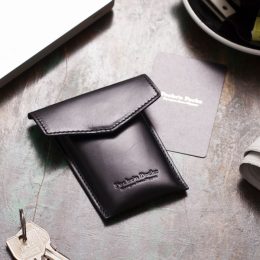 胸ポケットでフラップのようなアクセントになる本革カードケース。マグネットで固定でき、名刺や定期券をさっと取り出せる。プロダクト開発とデザイン担当。