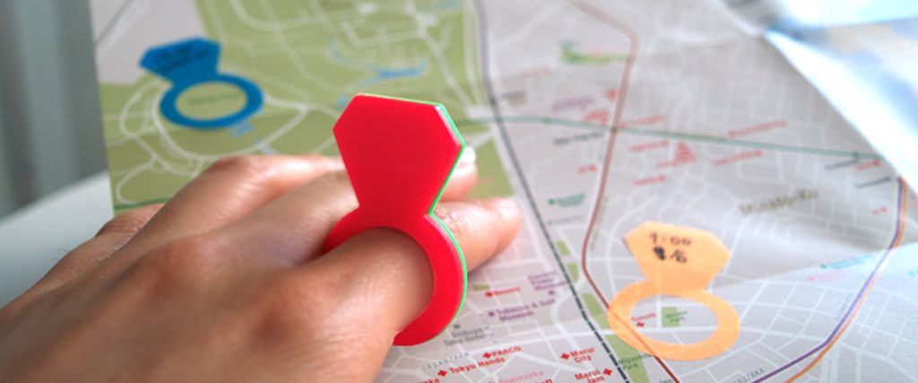 たとえば地図上で気になるポイントを囲むようにマッピング。宝石部分にコメントを添えて、